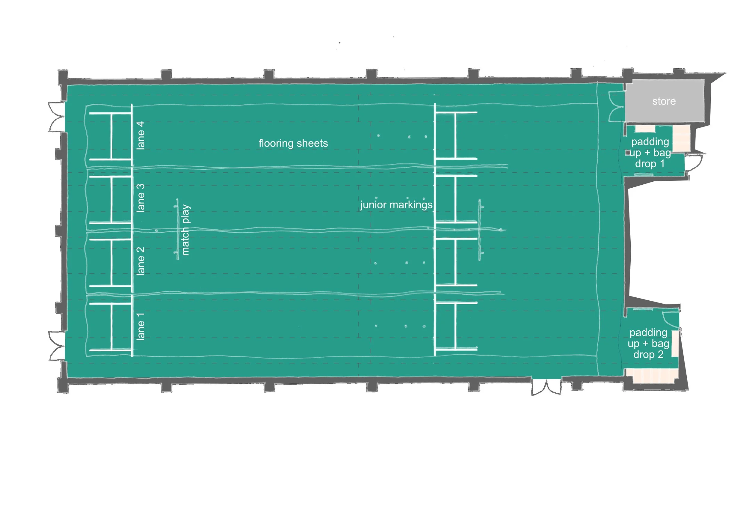 2 protected padding up and bag drop areas providing a safe transition and coaching space.